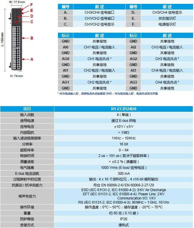 EtherCAT 4 通道模擬輸入擴(kuò)展模塊 - R1-EC8124D0